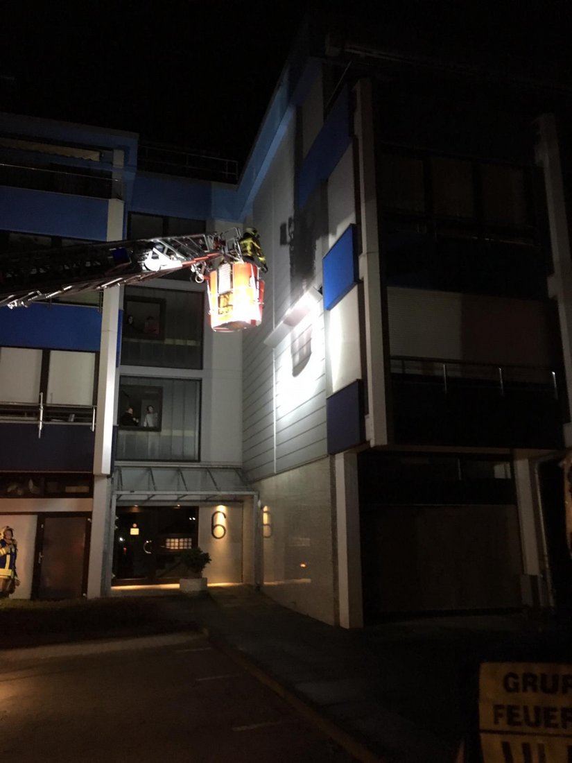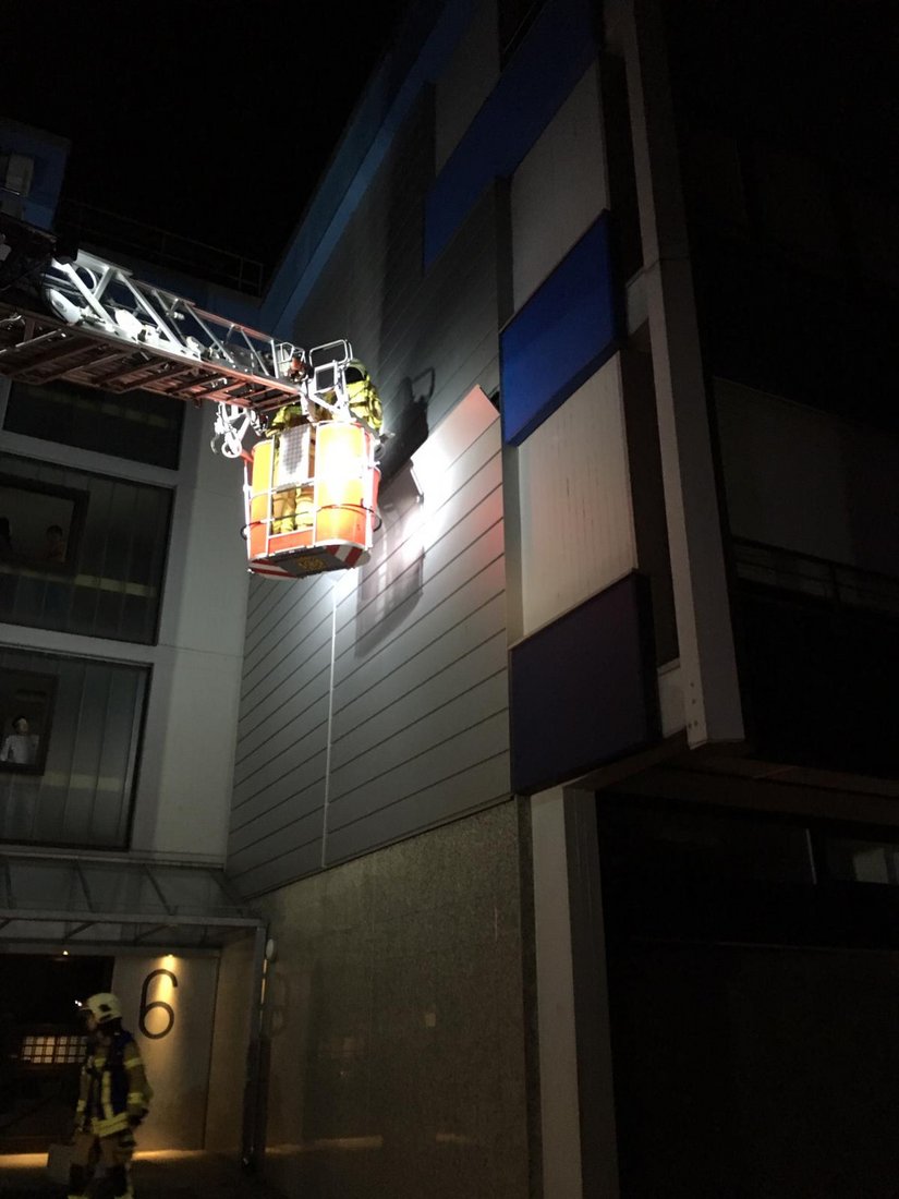 Nach Absperrung und Ausleuchtung der Einsatzstelle sicherten wir mittels Einsatz der Drehleiter die gelösten Teile und beseitigten so die Gefahrensituation im Hauseingangsbereich.