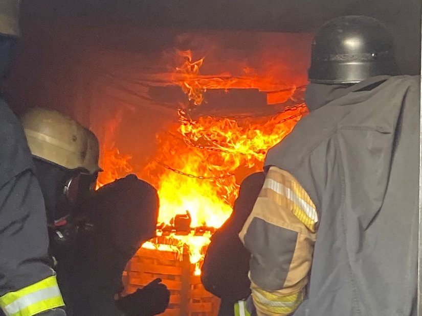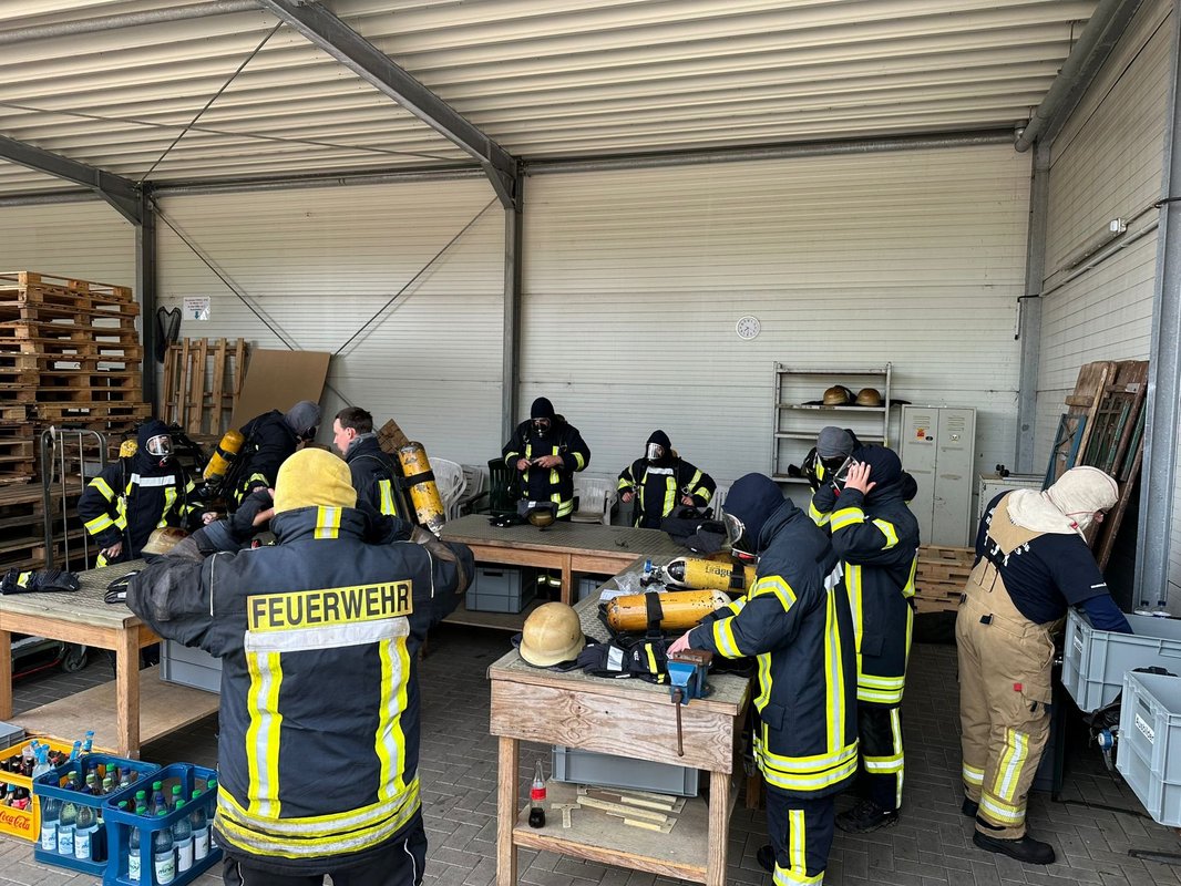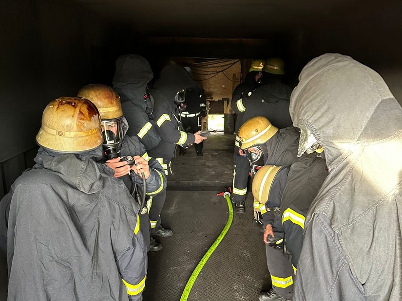 Unter schwerem Atemschutz gingen die sechs Kameraden in den Container und konnten dabei zusehen, wie sich das Feuer entwickelt und die Dynamik des Feuers beobachten.