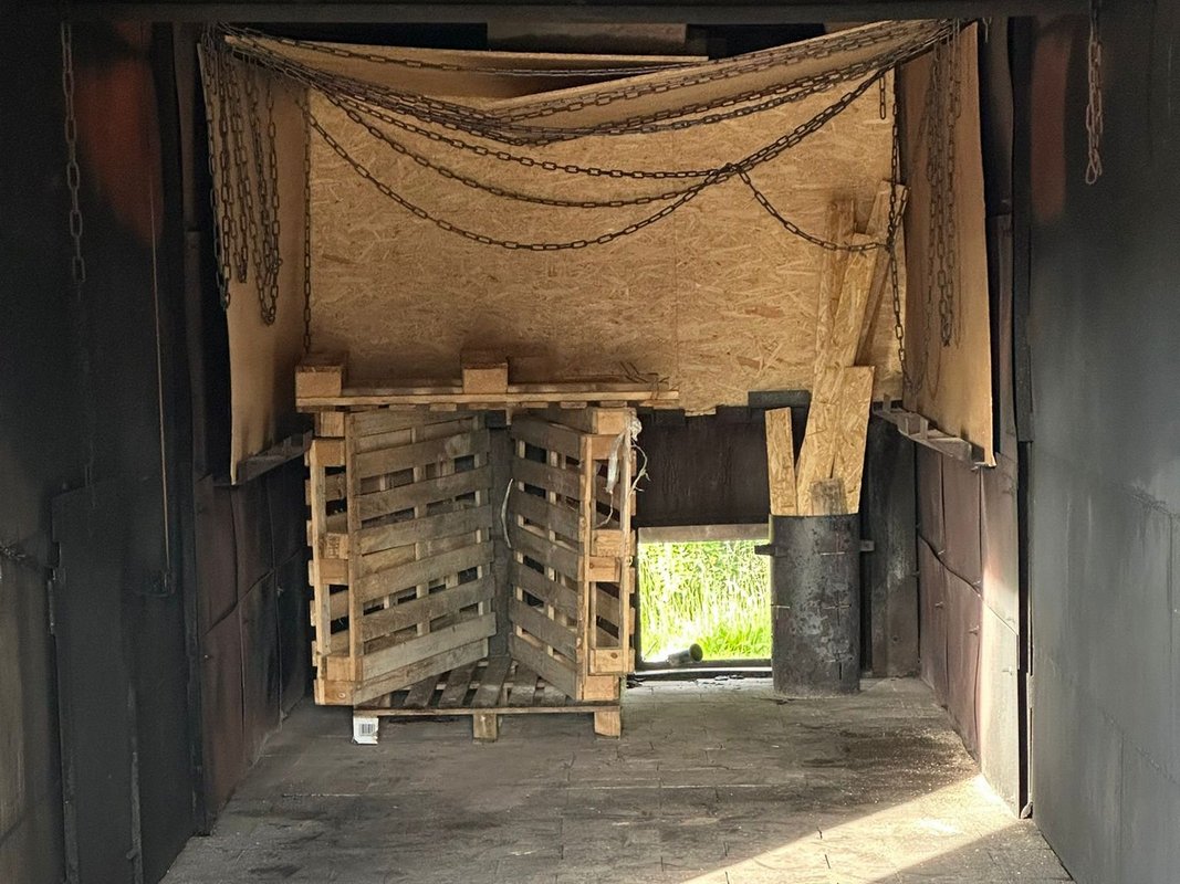 Dieser Container wird mit einem Feststofffeuer entzündet, also Resten von Holz und Paletten.