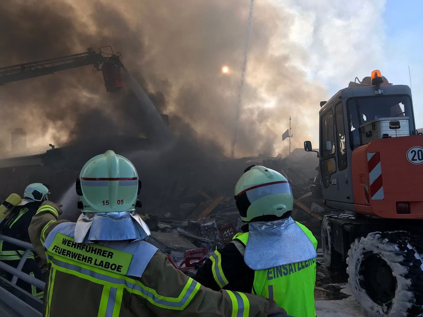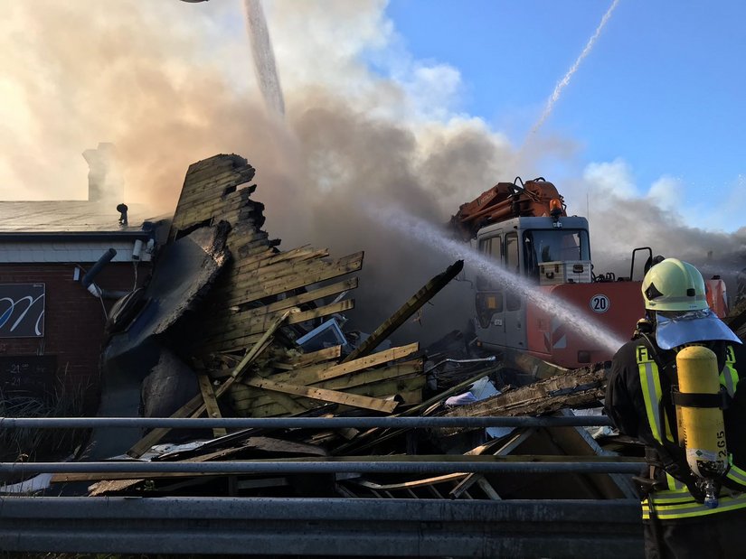 Trotz mehrfacher Versuche, blieb diese Maßnahme ohne Erfolg und der Einsatzleiter forderte einen Bagger und weitere Einsatzkräfte der Feuerwehren Wendtorf, Lutterbek, Probstei Nord und Probsteierhagen zum Einsatzort. Mittels schwerem Gerät wurde der Dachbereich geöffnet und konnte abgelöscht werden. Das Feuer im betroffene Küchentrakt hatte sich mittlerweile auf den Gastraum ausgebreitet. Auch hier musste der Bagger Wände und Decken abreißen, um das weitere Lauffeuer zu bekämpfen.