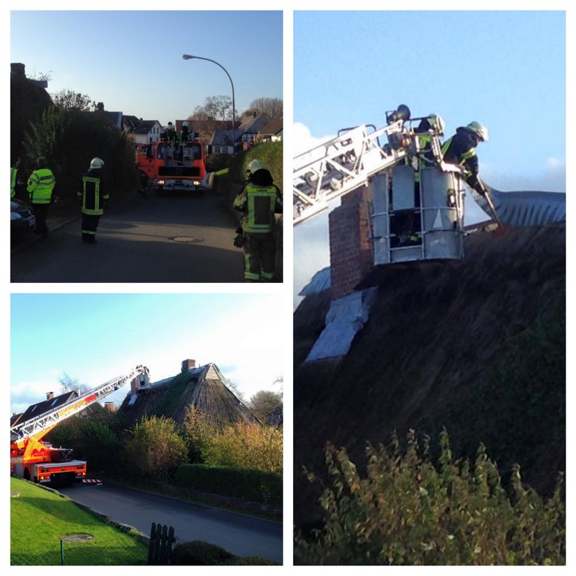 Am Freitagvormittag wurden wir zu einem Einsatz in Lutterbek gerufen. Von einem alten Reetdachhaus drohten Metallplatten vom Giebel zu stürzen. Da das Arbeiten mit der vierteiligen Steckleiter unmöglich war, unterstützten wir mit der Drehleiter. Gemeinsam mit den Kameraden der Feuerwehr Lutterbek wurden aus dem Korb heraus die Metallteile entfernt.