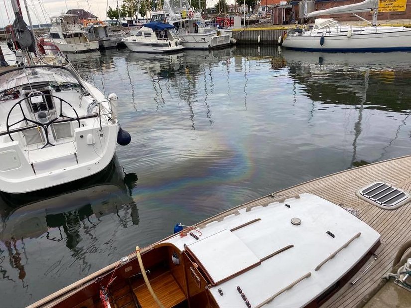 Im Bereich einer Werft war beim Kranen einer Segelyacht Hydrauliköl ausgetreten und hatte sich auf der Wasseroberfläche bunt schildernd verteilt.