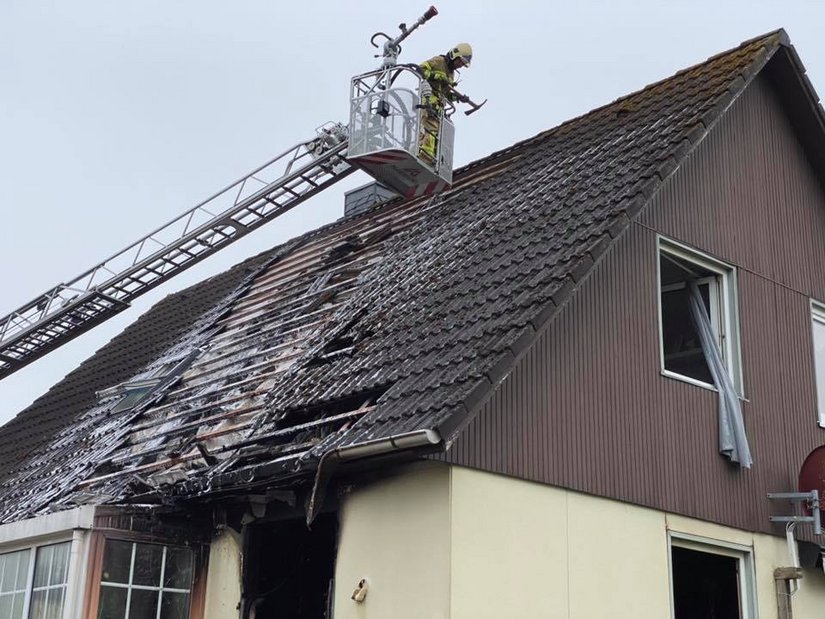 Nachdem der Innenbereich des Hauses gelöscht werden konnte, musste das Dach abgedeckt und abgelöscht werden, da sich das Feuer großflächig unter die Dachfläche gefressen hatte.