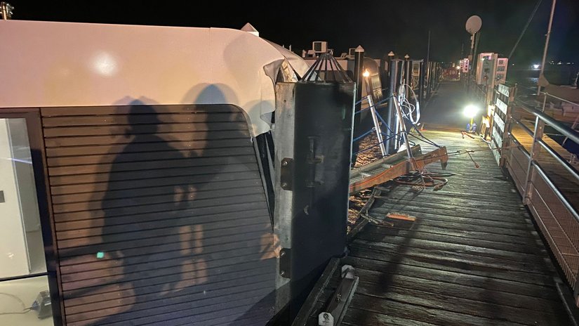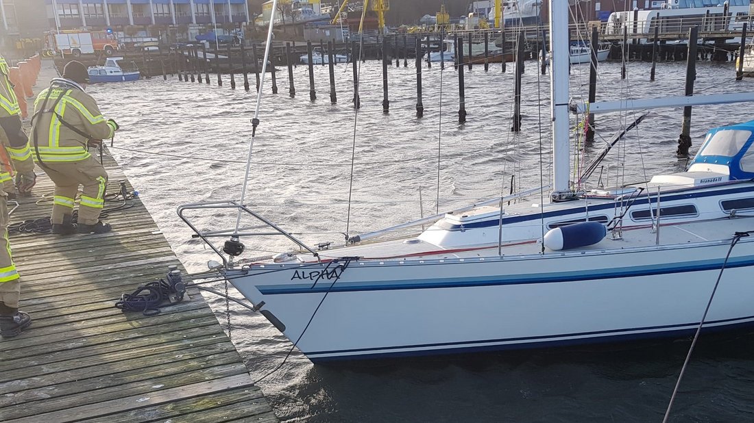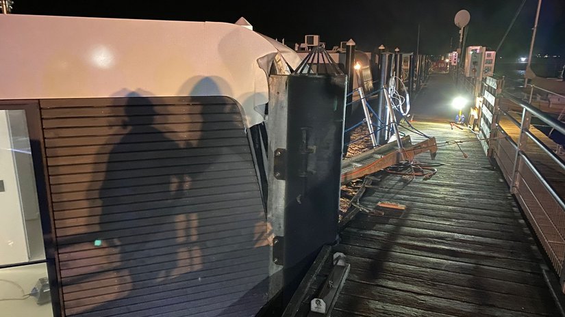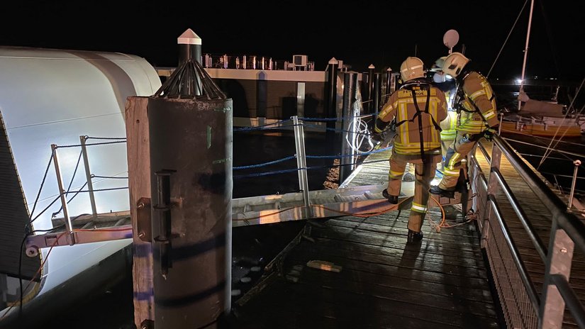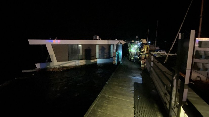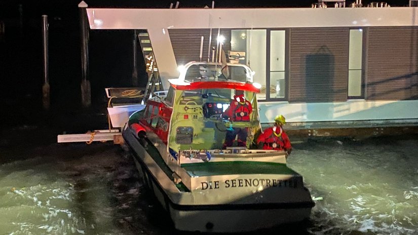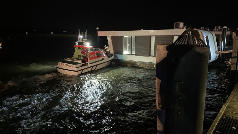 Um 05:10 klingelten unsere Melder zum ersten Mal des Tages. Wir wurden zu einem losgerissenen Hausboot gerufen. Bei dem Boot hatte sich eine Verriegeleung gebrochen, die das Boot im Normalfall an Ort und Stelle hält. Gemeinsam mit Kräften der DGzRS und dem Tochterboot "Stepke" gelang es uns nach einiger Zeit, das Hauboot zurück an seinen ursprünglichen Liegeplatz zu drücken. Schnell wurde das Hausboot mit mehreren Leinen wieder festgemacht. Aufgrund der enormen Kraft, die auf die Gangway gewirkt hat, kam es dazu, dass zu unserem Eintreffen die Eingangstür bereits aufgebrochen war.