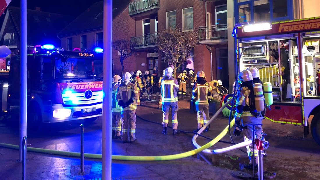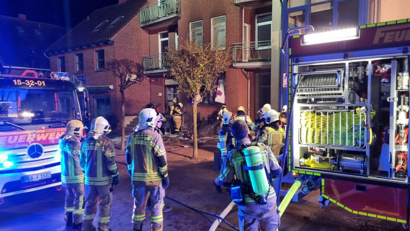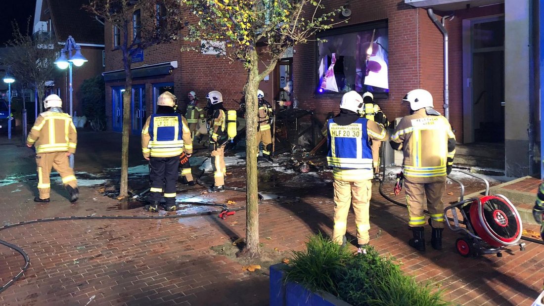 Als unser Einsatzleitwagen vor Ort eintraf, bestätigte sich das Meldebild. Die Flammen schlugen mittlerweile bis zur Höhe des ersten OG. Die Frontseitig liegende Verglasung war im Erdgeschoss bereits zerborsten und es musste somit verhindert werden, dass das Feuer in den Laden im Erdgeschoss übergreift.