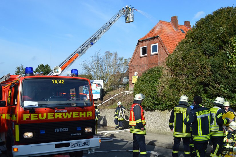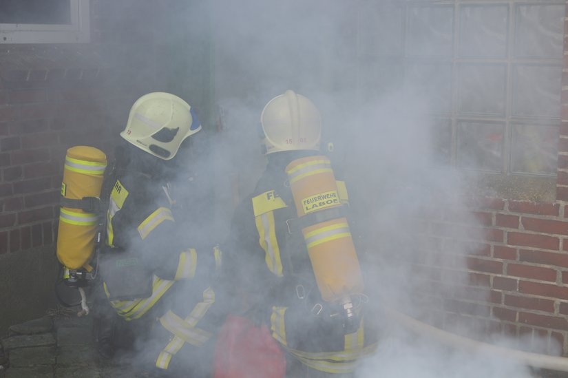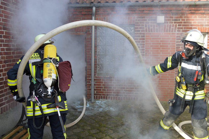 Dort wurde vielen schnell klar, dass es sich um eine Alarmübung, ausgearbeitet von Birger Möller & Sven Ehlers, handelte. Sofort wurden mittels Drehleiter Personen aus dem 1.OG gerettet. Gleichzeitig drangen mehrere Trupps unter schwerem Atemschutz gewaltsam in das Gebäude ein und fanden weitere schwer verletzte Personen.