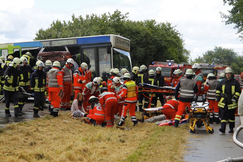 Heute Mittag wurde die Feuerwehr Laboe mit weiteren Kräften zu einem Massenanfall von Verletzten nach Stein alarmiert. Gemeldet wurde eine Massenkarambolage mit mehreren PKW's und einem Bus. Am Einsatzort übernahm die Feuerwehr Laboe den nördlichen Abschnitt und befreite und betreute mehrere Patienten.