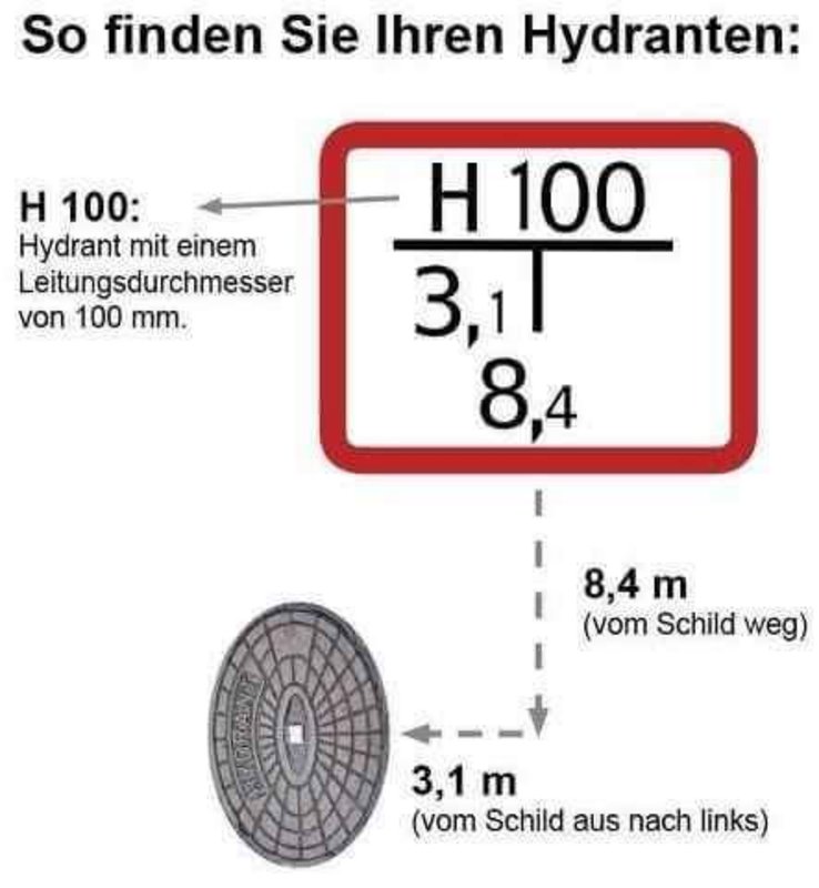 Doch wie finden Sie einen Hydranten vor ihrem Haus? Auf dem Foto finden Sie eine grafische Darstellung eines Hydrantenschildes und deren Erklärung. Wir möchten Sie freundlichst bitten ihre angrenzenden Hydranten stets freizuhalten, auch im Interesse ihre eigenen Sicherheit.