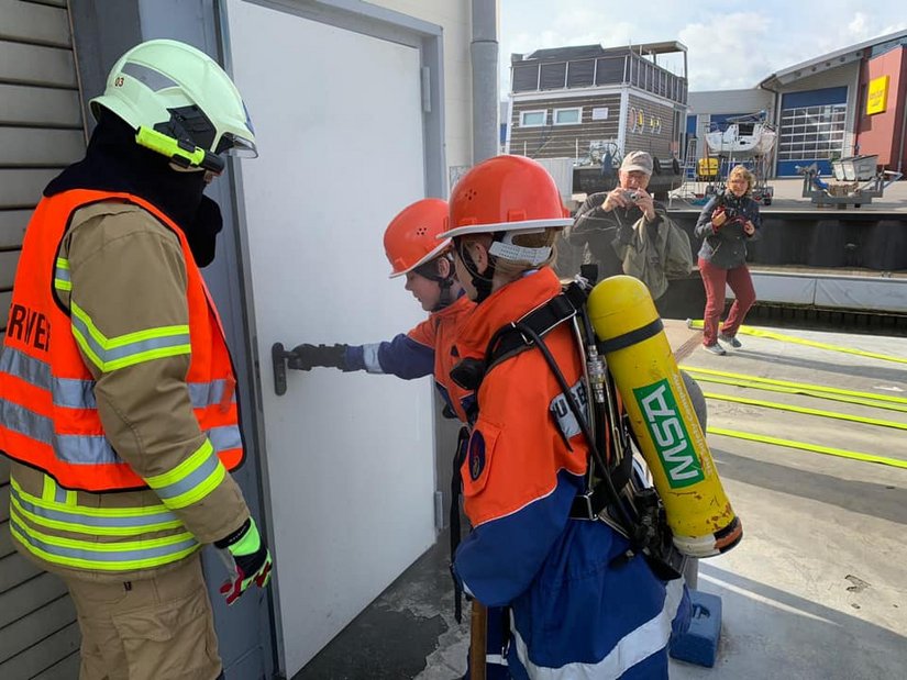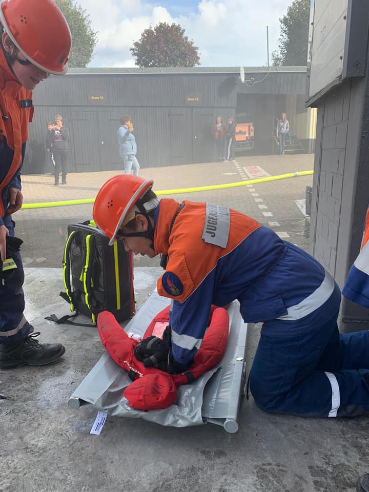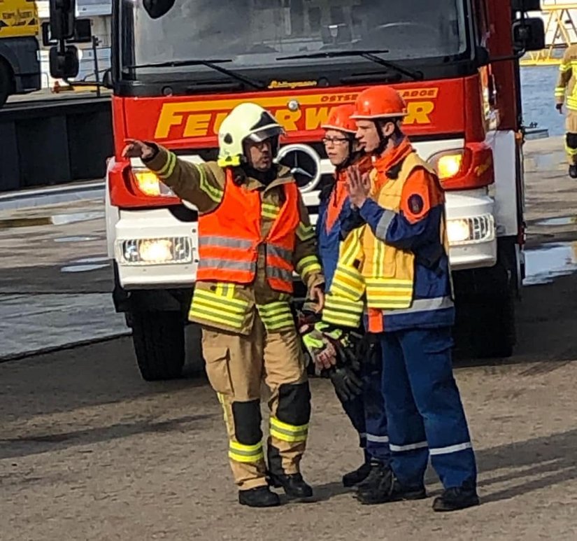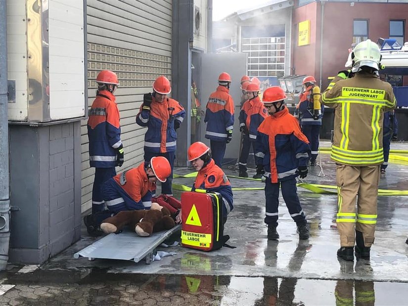Diesmal hieß es „Feuer in einer der Hallen der Laboer Schiffswerft und mehrere vermisste Personen“. Nach dieser Meldung alarmierte unser Einsatzleiter Jannis gleich die beiden Nachbar-Jugendfeuerwehren aus Brodersdorf und Stein nach. Parallel dazu rüsteten sich gleich zwei Laboer Trupps mit Atemschutz(attrappen) aus und machten sich auf die Suche nach den vermissten Personen. Weitere Trupps bauten die Wasserversorgung auf und begannen mit dem Löschen von außen.