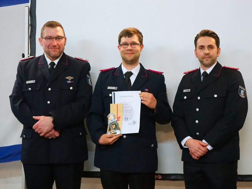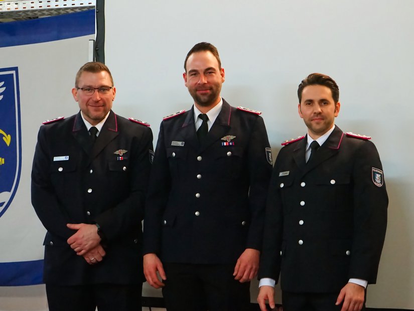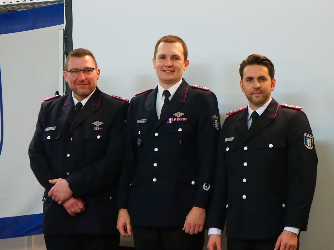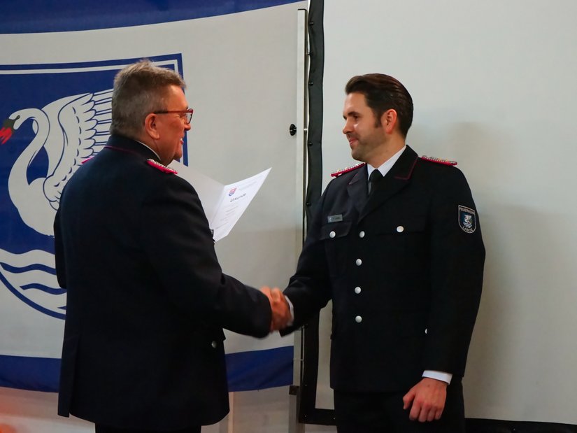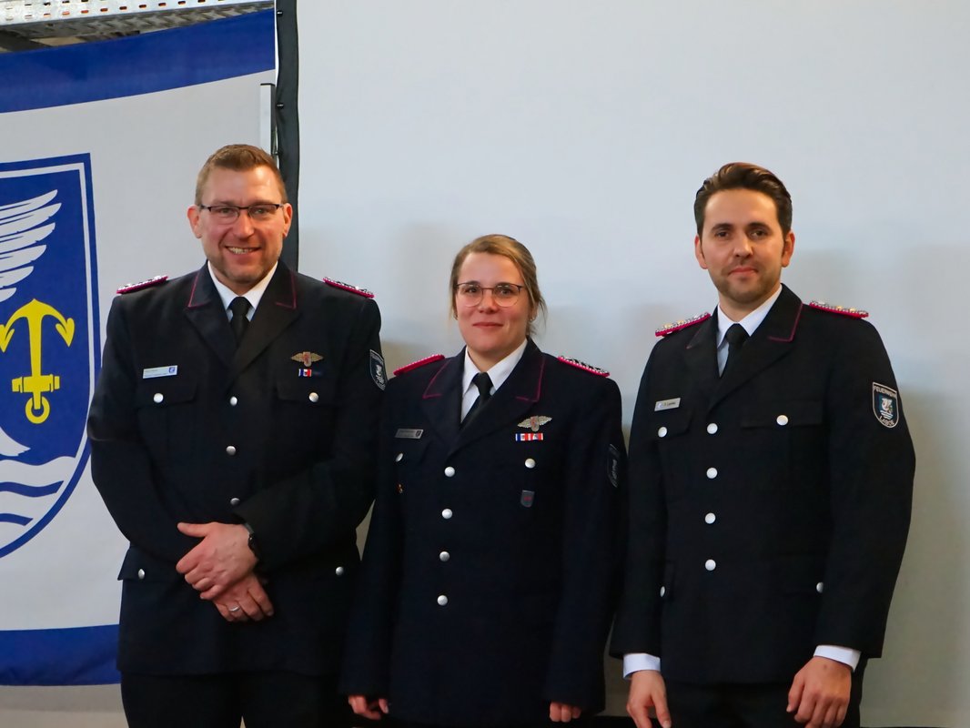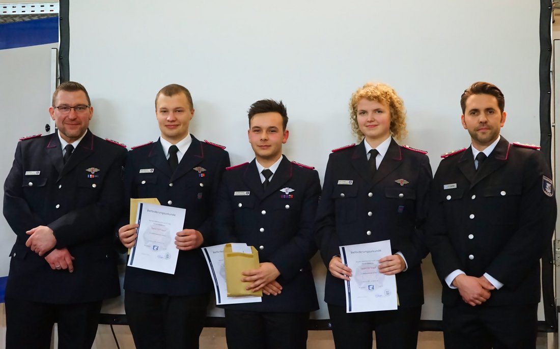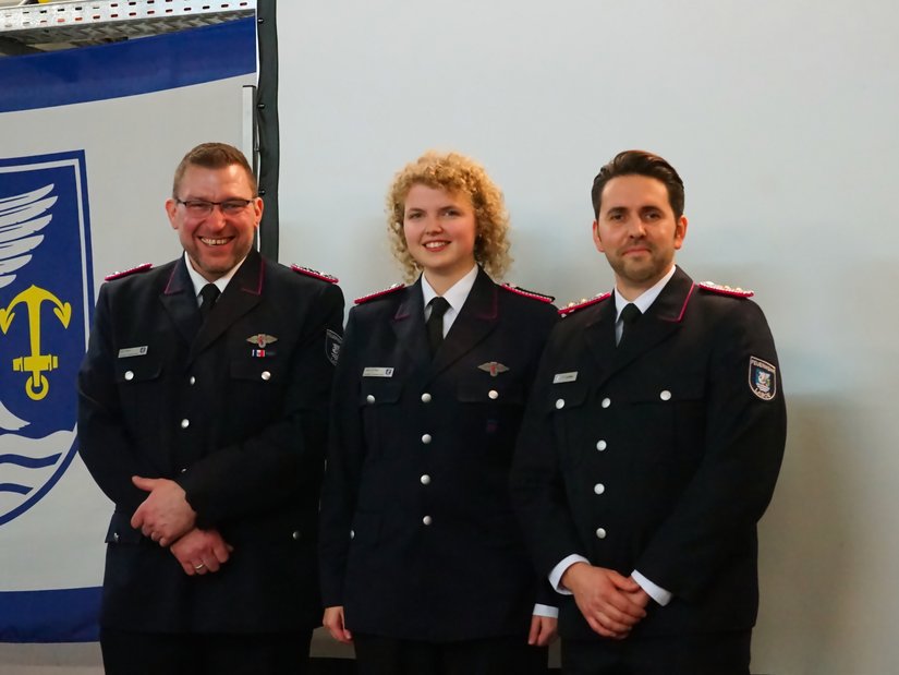 Befördert wurden Leilani de Graaf zur Oberfeuerwehrfrau sowie Tom Dorring und Marlon Schramm zum Oberfeuerwehrmann. Gemeindewehrführer Fabian Lemke wurde zum Hauptbrandmeister mit drei Sternen befördert.