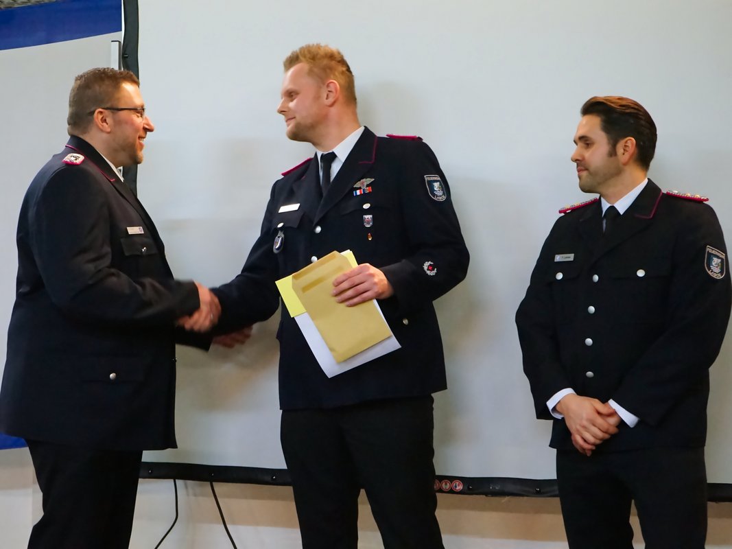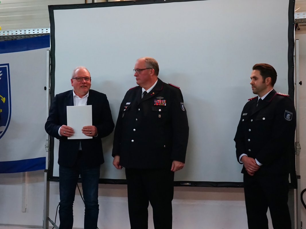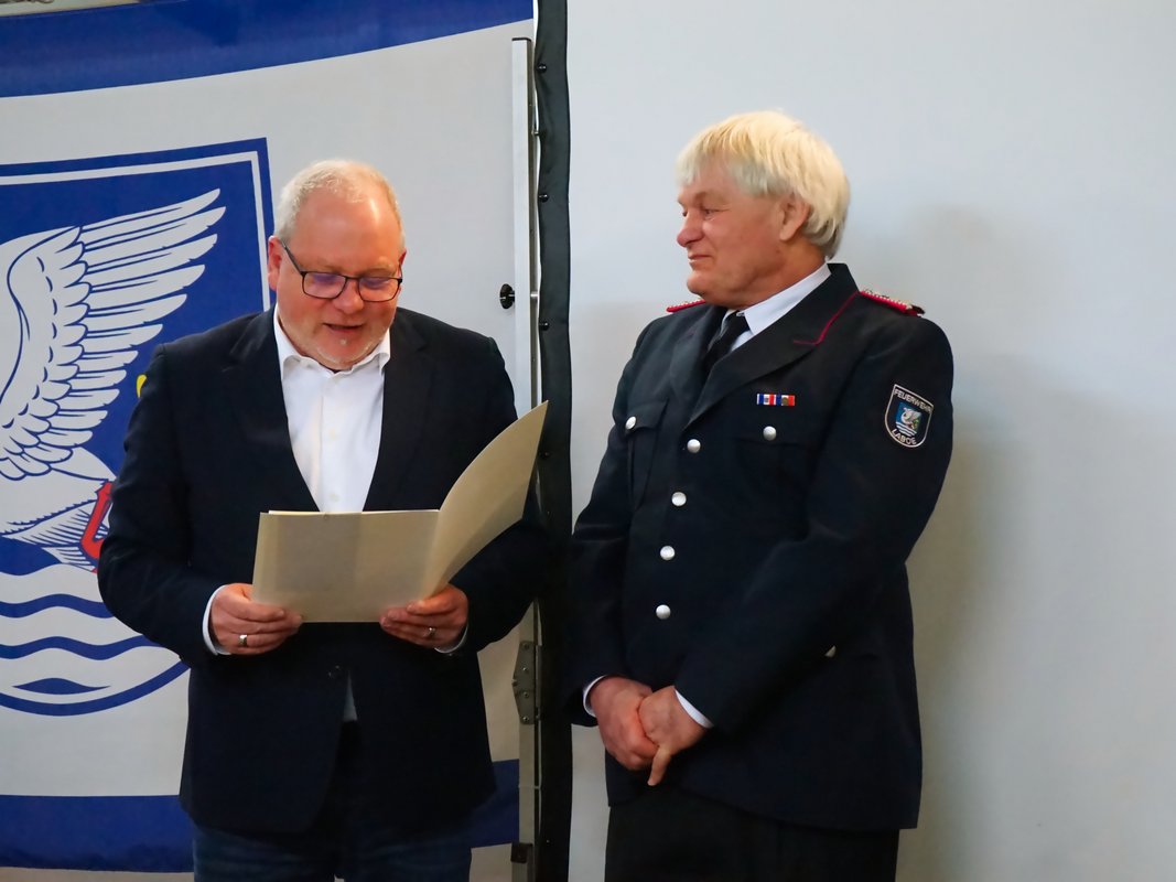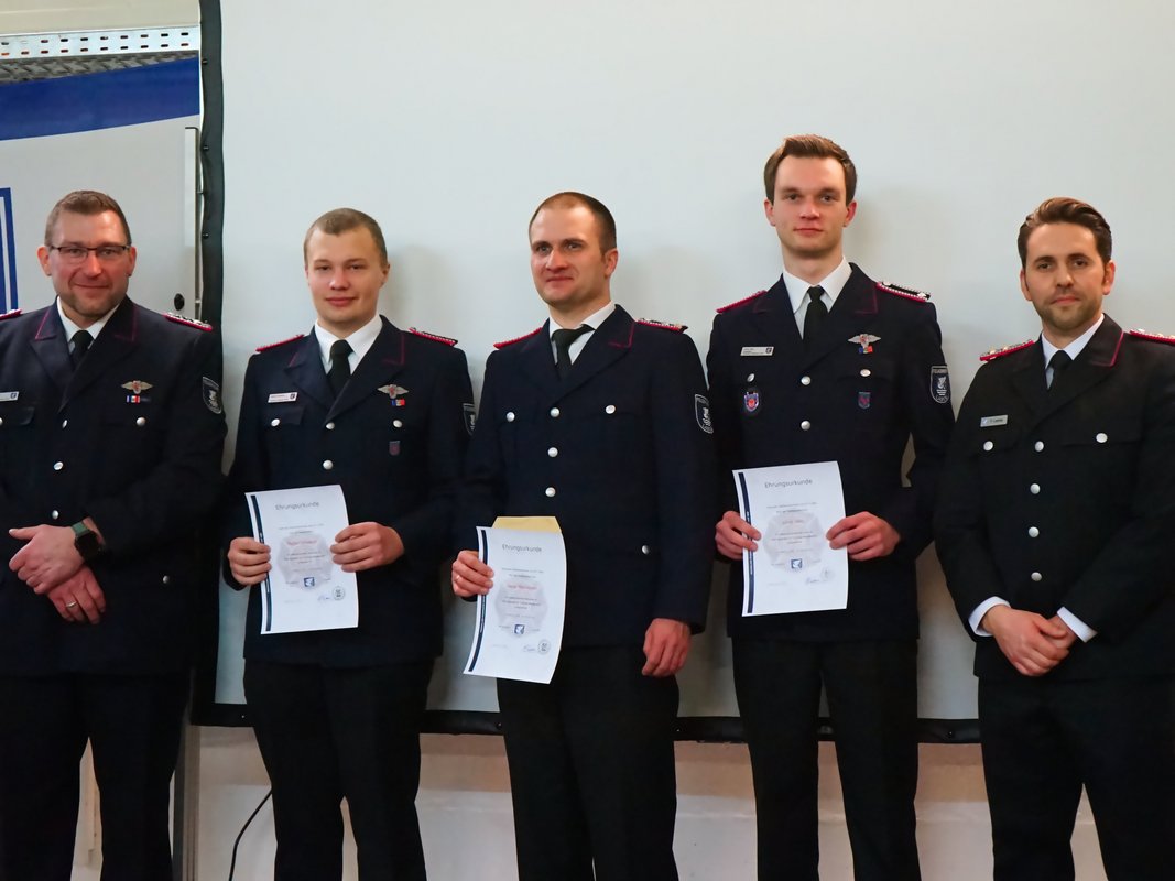 Für ihre langjährige aktive Dienstzeit wurden zahlreiche Kameraden geehrt: Volker Arp erhielt für 40 Jahre aktiven Dienst das Brandschutzehrenzeichen in Gold am Bande. Stephan Pickel und Thomas Jansen wurden für 25 Jahre mit dem Brandschutzehrenzeichen in Silber am Bande ausgezeichnet. Weitere Ehrungen erhielten Stefan Jahn und Stephan Pickel für 30 Jahre sowie Christian Fischer für 20 Jahre aktive Dienstzeit. Marlon Schramm, Linus Jahn und Vasily Nakostenko wurden für 10 Jahre aktiven Dienst geehrt. Feuerwehrmitglied des Jahres 2025 wurde Dennis Schalkowski, der sich durch eine besonders hohe Dienstbeteiligung auszeichnete.
