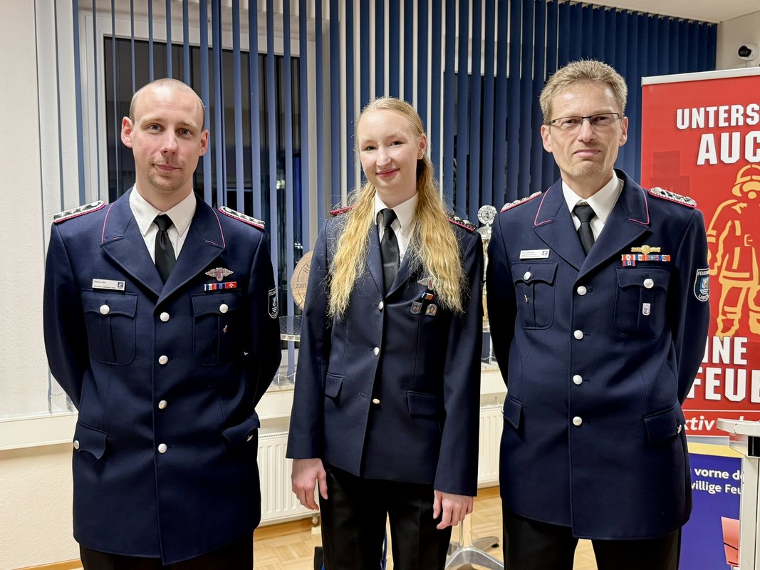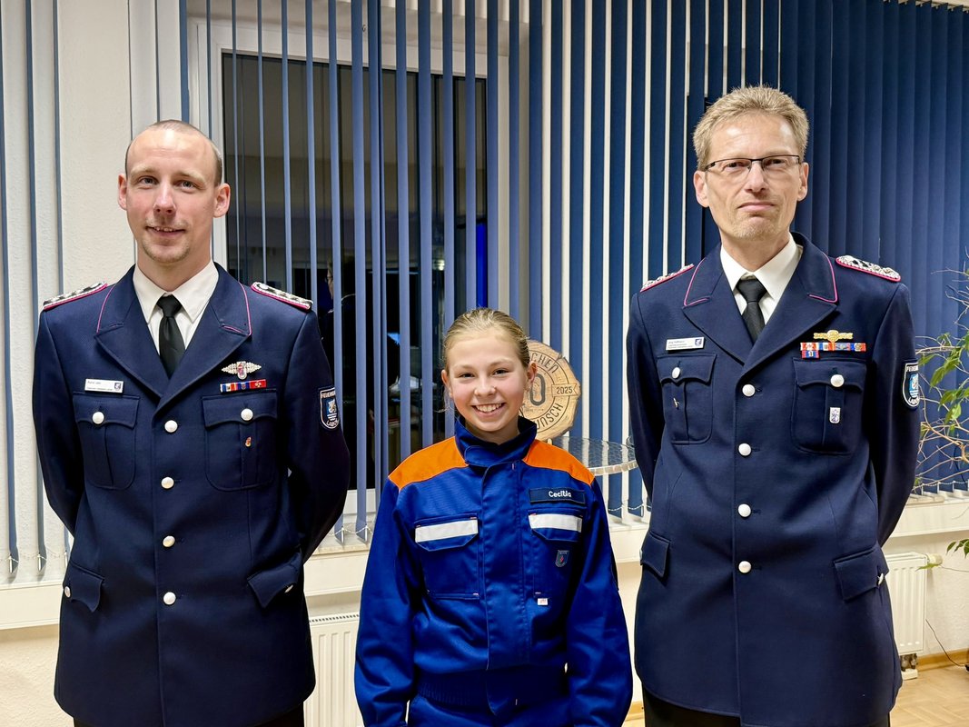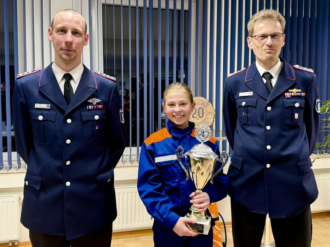 Anschließend folgte der wohl spannendste Teil des Abends: die Ehrung zum Jugendfeuerwehrmitglied des Jahres. Mit einer Dienstbeteiligung von beeindruckenden 99 Prozent wurde Cecilia diese besondere Auszeichnung verliehen.