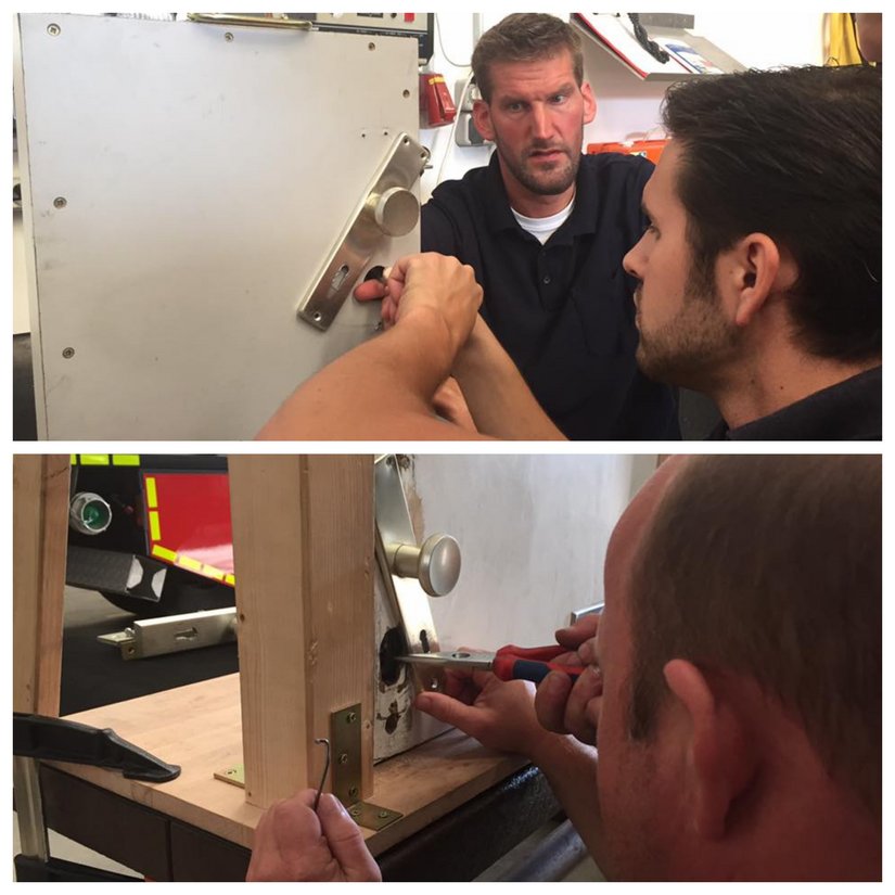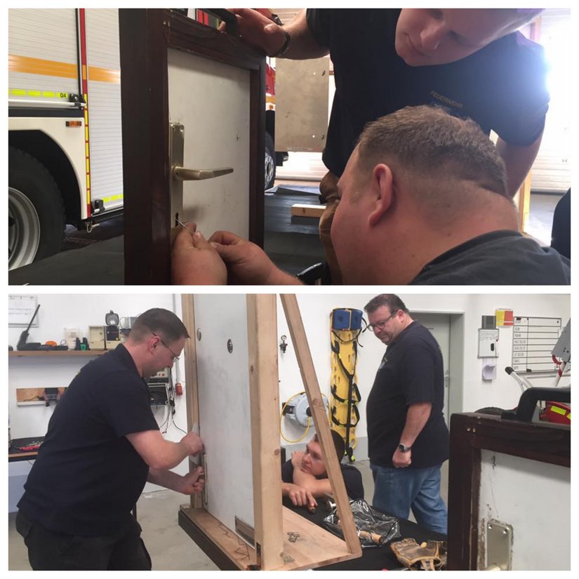 Mithilfe von diversen Dietrichen, Hebelwerkzeugen, Zugwerkzeugen und Universalschlüsseln wurden die verschiedensten Varianten geübt. Ziel war es so wenig Schaden wie möglich zu generieren. Am Ende des Tages konnte jeder Teilnehmer die verschiedenen Schlösser wie zB. Chubb-Schloss, Buntbartschloss, Profilschloss mit oder ohne Sicherheitsbeschlag unterscheiden, sondieren und öffnen. Insgesamt wurden fast 8 Stunden gemeinsam verbracht und ein Entwurf einer Übungstür dem Wehrführer Jahn vorgelegt, um in Zukunft fit für Ihre Sicherheit zu bleiben.