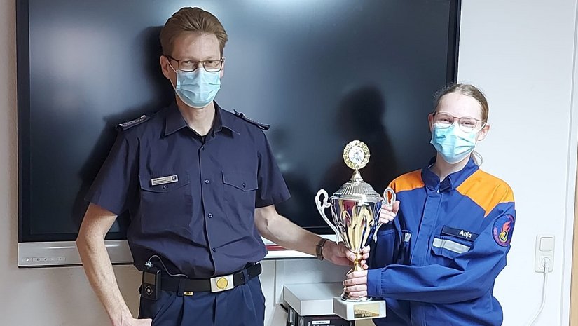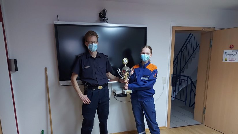 „Das Mitglied hatte eine Dienstbeteiligung von 86%“, hieß es. „Das Mitglied ist 2019 in die JF Laboe eingetreten“. Alle haben geraten. „Hatte gestern ihren 14. Geburtstag…“, ab da war es klar: Jugendfeuerwehrmitglied des Jahres 2020 ist Anja Roschinski. Sie war überrascht und bekam den neuen Wanderpokal übergeben. Die JF Laboe gratulierte ihr und der stellv. Gemeindewehrführer Fabian Lemke bedankte sich bei der Jugendfeuerwehr, dass sie sich dieses Hobby ausgesucht haben und schenkte uns Mut, dass wir uns bald wieder sehen und gemeinsam Dienste machen können. Danach beendete Jörg den Dienst und machte uns auf den nächsten besonderen Dienst neugierig.