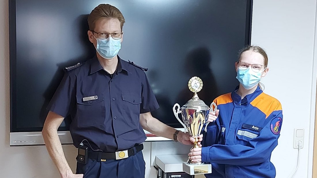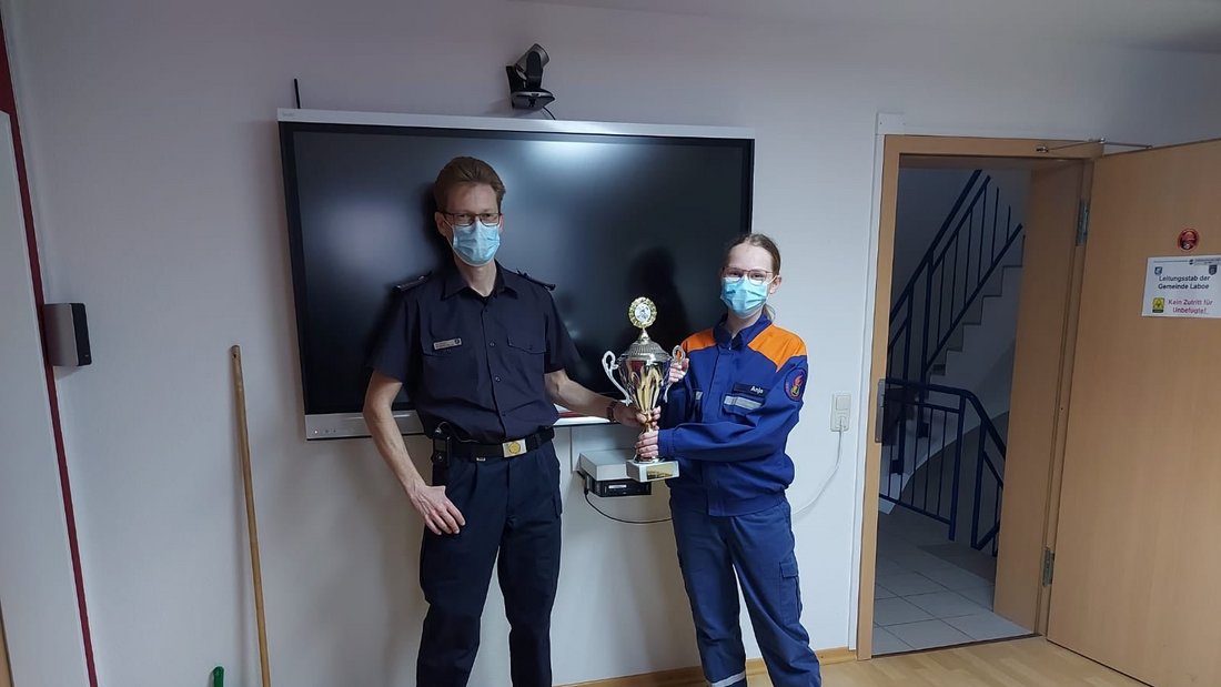 Als wir uns dann unsere PSA angeguckt haben, hatte Jörg eine Überraschung: Er zeigte uns eine PowerPoint-Folie mit der Überschrift „Jugendfeuerwehrmitglied des Jahres 2020“. Diese Ehrung hätte eigentlich auf unserer Jahreshauptversammlung stattfinden sollen, aber die ist wegen Corona ausgefallen.