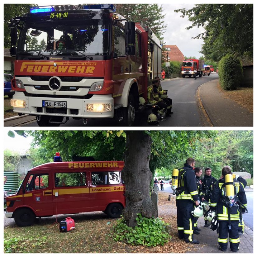 Die Feuerwehr Laboe war mit dem ELW 1, LF 20, DLK, HLF 20, GW-L 1 mit dem Atemschutzrollwagen, MTF, GW Dekon-P und 27 Einsatzkräften vor Ort.