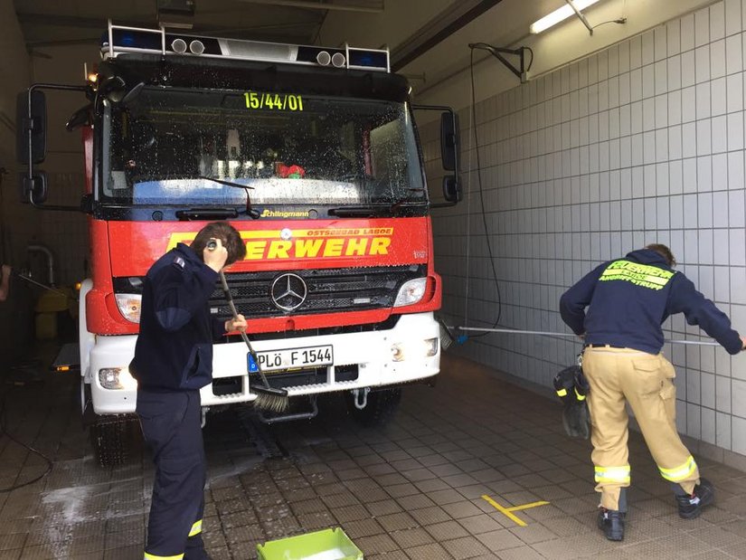 Am Ende der Veranstaltung wurden noch gemeinschaftlich alle Löschfahrzeuge gereinigt. Da hier nach dem Motto: "Viele Hände, schnelle Hände", gearbeitet wird, war nach gut 60 Minuten alles wieder Tip Top. In Laboe halten alle Mitglieder eng zusammen und bilden dadurch eine unschlagbare Mannschaft.