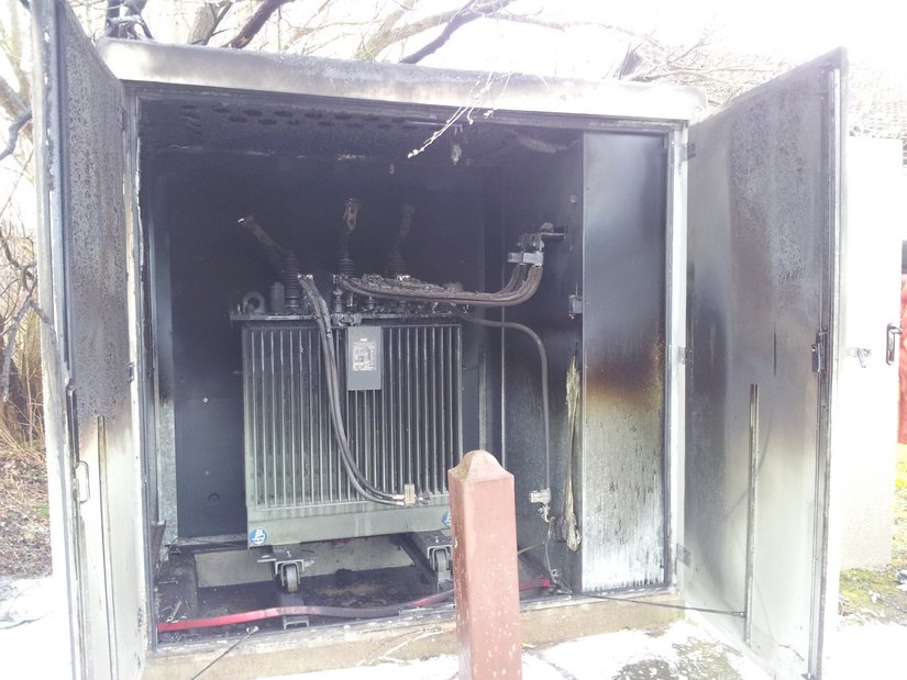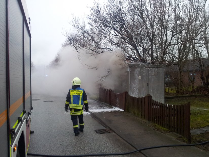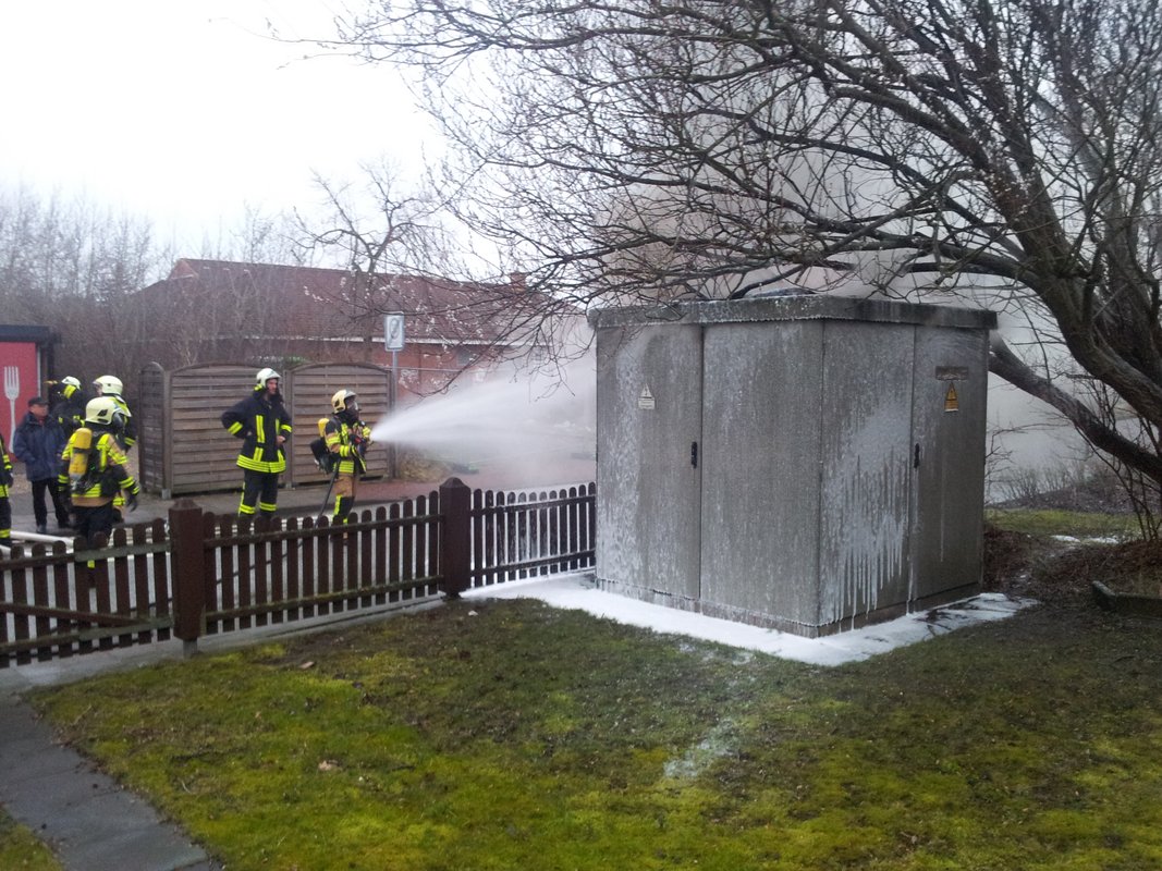 Um kurz vor halb 8 wurde die Feuerwehr Laboe zu einem Stromkastenbrand im Schwanenweg alarmiert. Bereits auf der Anfahrt vieler Einsatzkräfte zum Feuerwehrhaus war eine große Rauchsäule über dem Ort sichtbar. Am Einsatzort wurde der Vollbrand eines Starkstromtrafohäuschens festgestellt. Mittels Schnellangriff und unter schwerem Atemschutz wurde der Brand von außen bekämpft. Da der Zugang zum Inneren des Hauses durch Türen und Schlösser versperrt war, entschied der Einsatzleiter auf den angeforderten Stördienst zu warten und solange das Feuer unter Kontrolle zu halten. Nach ca 90 Minuten konnte der Leitstelle "Feuer aus" gemeldet werden.