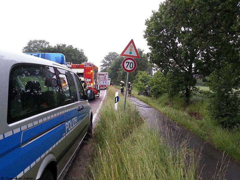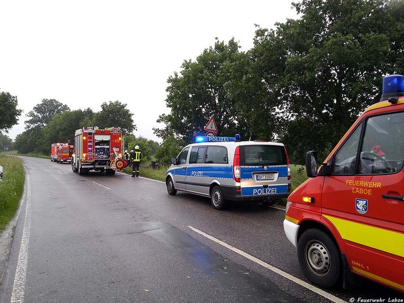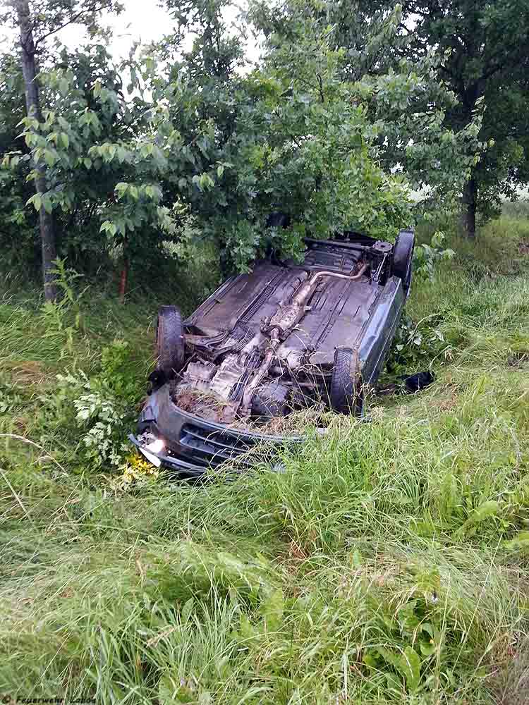 Um kurz vor halb 7 alarmierte die Leitstelle die Feuerwehr und den Rettungsdienst zu einem Verkehrsunfall auf der Kreisstraße 30 bei Laboe. Ein PKW mit zwei Insassen hatte sich überschlagen und war kopfüber in einem Graben gelandet. Am Einsatzort hatten sich die Patienten schon selbst aus dem PKW befreit und wurden vom Rettungsdienst versorgt. Die Feuerwehr stellte den Brandschutz dar, klemmte die Batterie ab und fing auslaufende Betriebsstoffe auf.