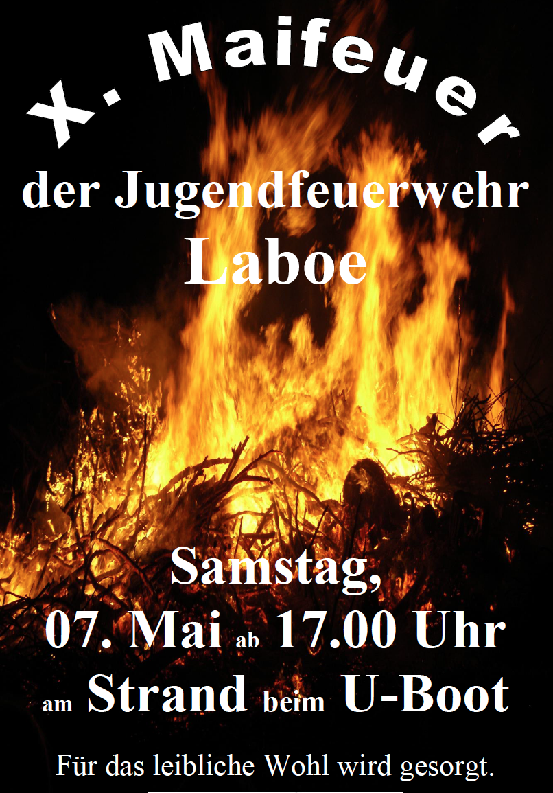 In diesem Jahr steht das 10. Maifeuer der Jugendfeuerwehr am 7. Mai 2016 ab 17h am Freistrand beim U-Boot in Laboe an. Wir möchten Sie gerne herzlichst Einladen. Neben frischer Wurst vom Holzkohlengrill und kühlen Getränken bietet die Feuerwehr auch Stockbrot für die Kleinen an. Zusätzlich können Sie sich über die Arbeit der Feuerwehr informieren oder ein Einsatzfahrzeug besichtigen.